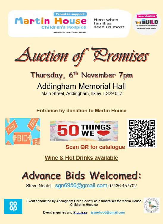 Auction of PromisesAddingham Civic Society's Auction of Promises in aid of Martin House "The Build". A fabulous array of 57 varied lots from experiences, golf, fishing, hair an...