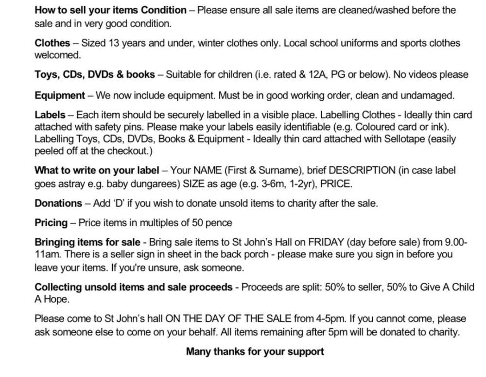 Nearly new children’s clothing, toys and equipment sold on 50/50 basis to raise money for Give A Child A Hope - supporting the Revival centre school in Uganda.