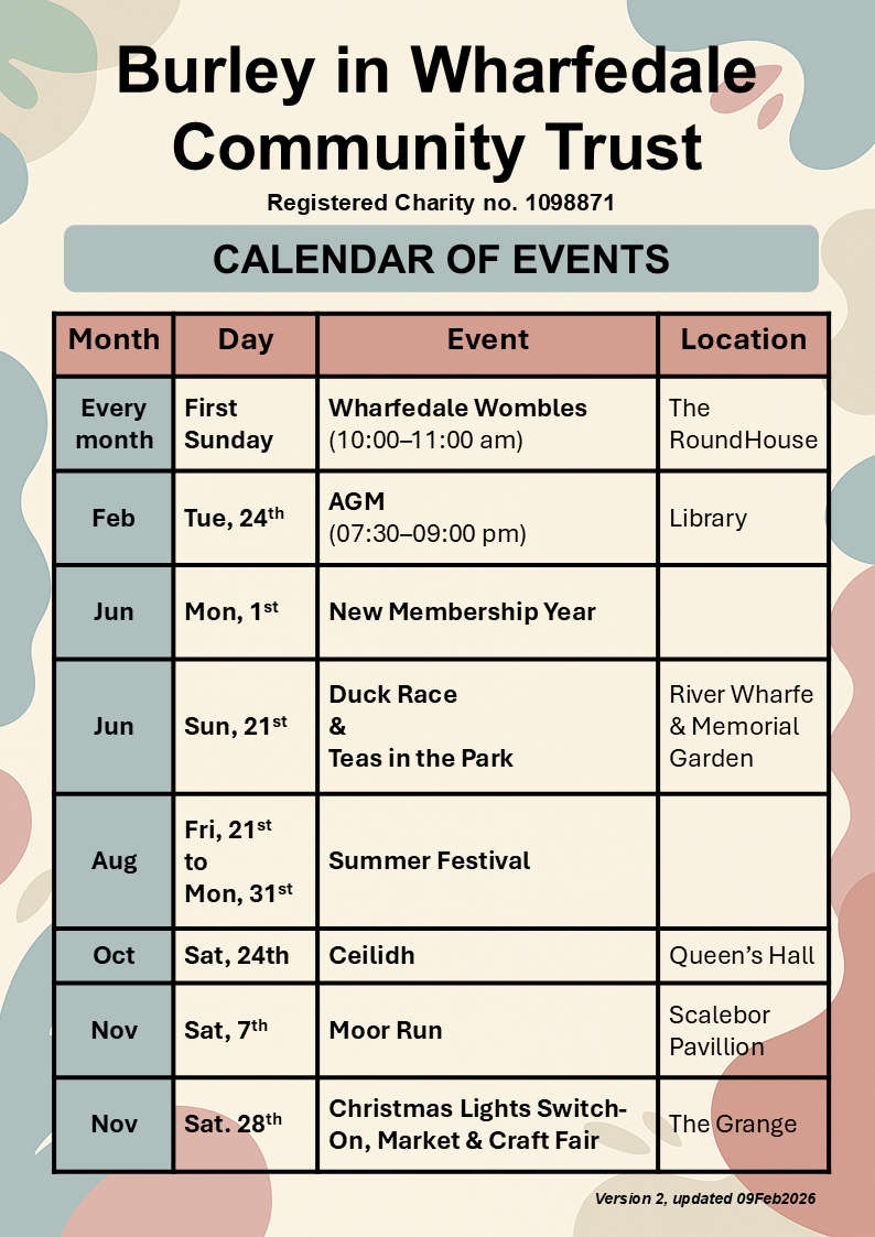 To view the BWCT’s work while minutes are prepared, please visit our information boards at Burley Library, or get in touch by visiting www.burleyinwharfedalecommunitytrust.org.uk.