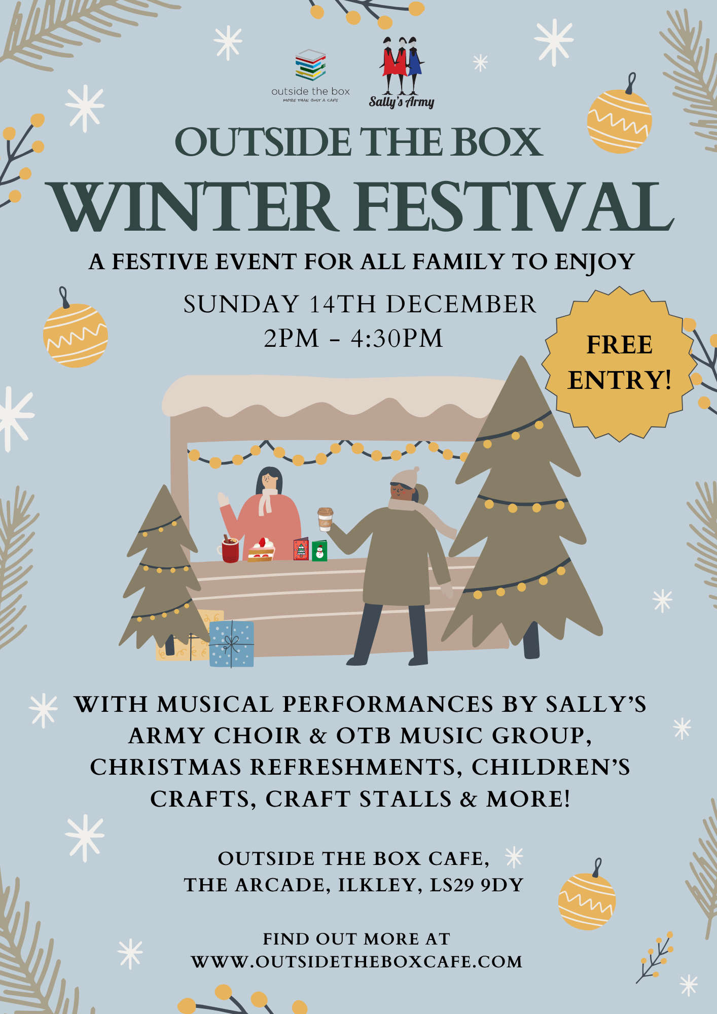 In partnership with Sally’s Army Choir, the free-entry Festival will include carol singing and musical performances with the choir and OTB Music Group. Visitors can also enjoy seasonal refreshments including homemade mince pies made by the inclusive Outside the Box team and delicious mulled wine as well as festive stalls and a variety of Christmas themed crafts throughout the afternoon.