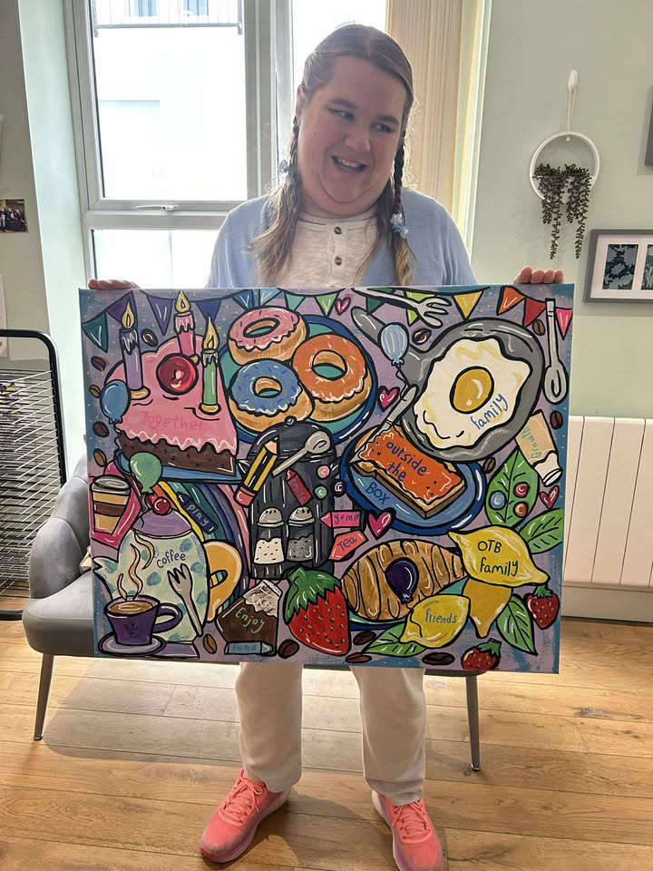 After discovering Emy’s work on social media, the team at Outside the Box [OTB] commissioned her to create a piece for the café’s family area. OTB said Emy exceeded all expectations, producing a large, colourful artwork that celebrates inclusivity, community, delicious food, and everything that makes Outside the Box special. In addition to the main piece, Emy generously donated several smaller artworks to brighten the space even further.